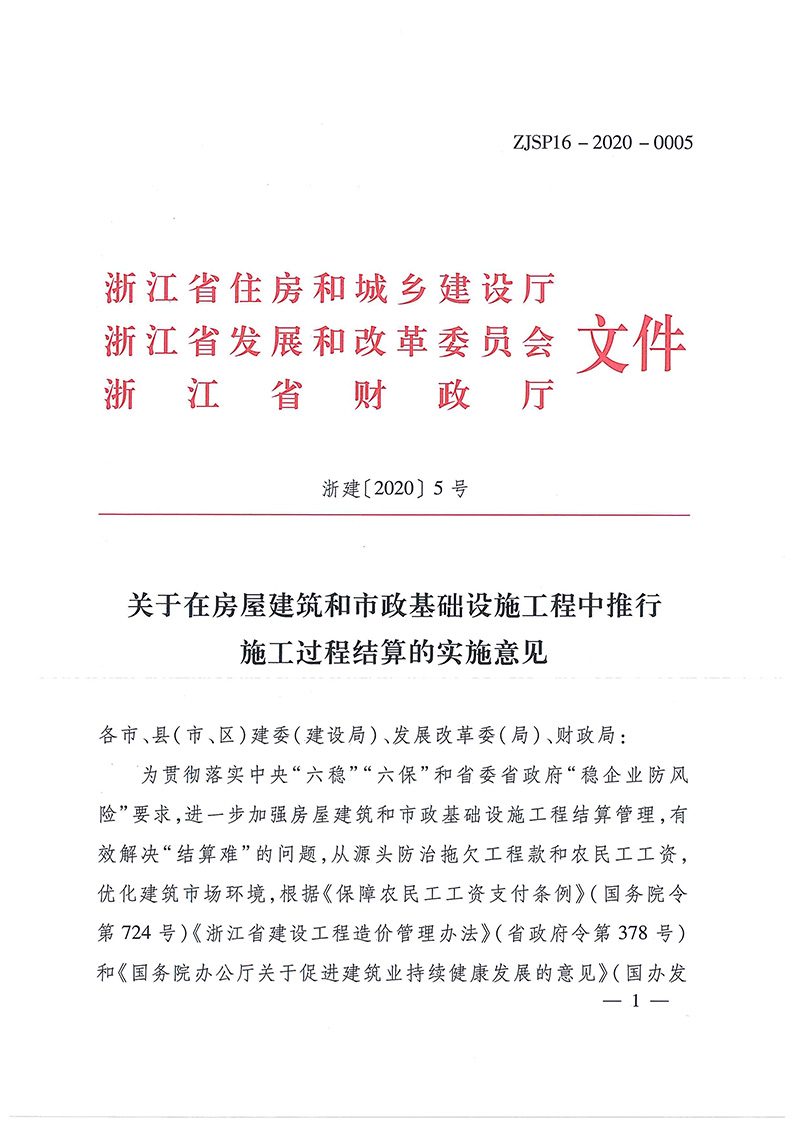 為貫徹落實中央 “ 六穩”“ 六?!?和省委省政府"穩企業防風要求,進一步加強房屋建筑和市政基礎設施工程結算管理,有效解決 “結算難 " 的問題,從源頭防治拖欠工程款和農民工工資,優化建筑市場環境,根據《保障農民工工資支付條例》(國務院令第724號)《浙江省建設工程造價管理辦法》(省政府令第378號)和《國務院辦公廳關于促進建筑業持續健康發展的意見》(國辦發[2017] 19號)《浙江省人民政府辦公廳關于全面治理拖欠農民工工資問題的實施意見》(浙政辦發[2017]34號)等規定,現就我省房屋建筑和市政基礎設施工程中全面推行施工過程結算提出如下實施意見,請認真貫徹執行。