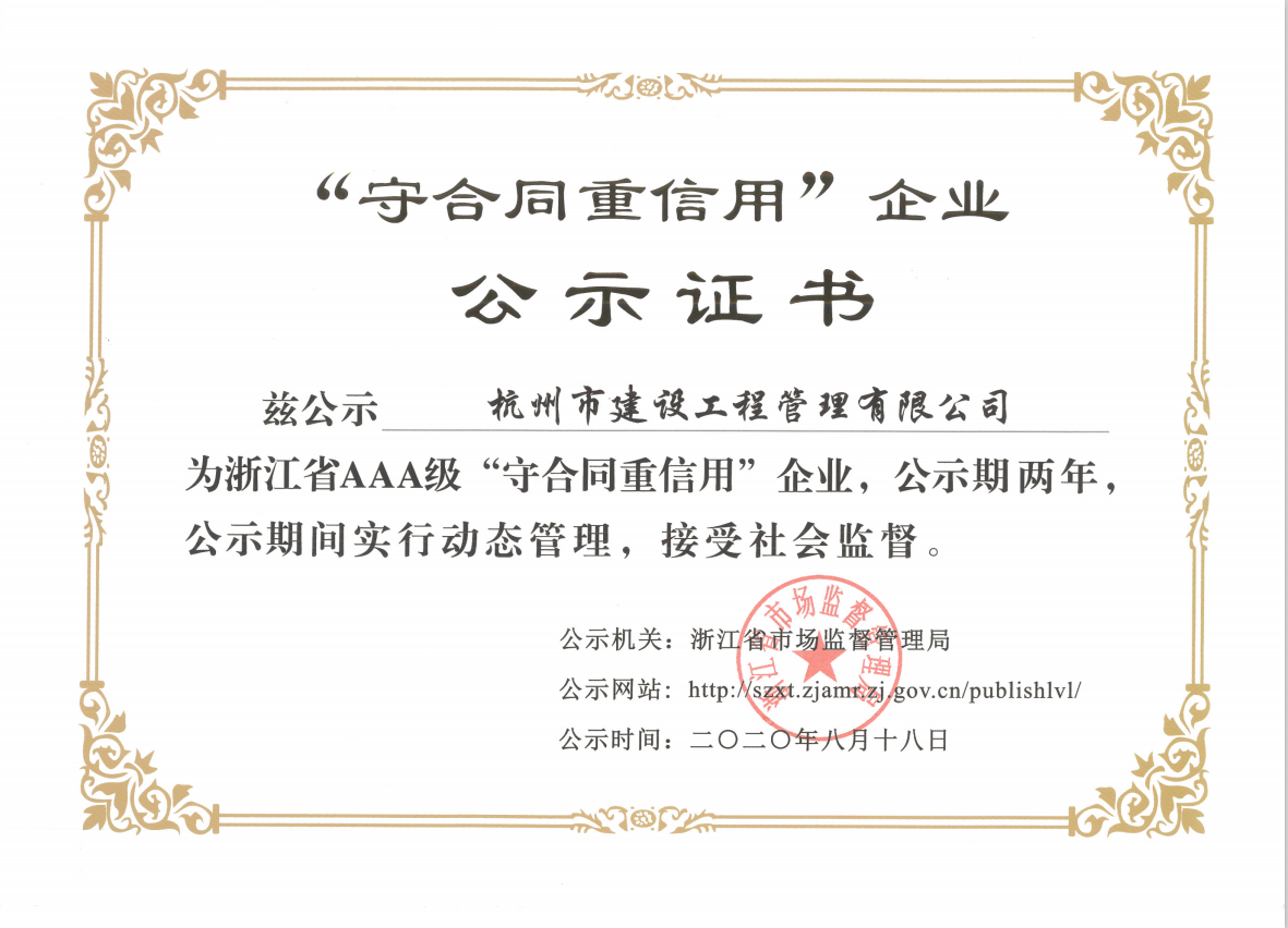 杭州市建設工程管理有限公司榮獲2020年浙江省AAA級“守合同重信用”公示證書,不僅證實了杭建“不信不立,不誠不行”一諾千金的企業行為,而且證明了杭建人在砥礪前行的道路上工作井然有序與有條不紊,我們將堅持以嚴謹的工作態度、實事求是、科學公正的立場,致力于招標代理和造價咨詢事業。公司全體員工衷心感謝廣大新老客戶對公司發展的支持和幫助!